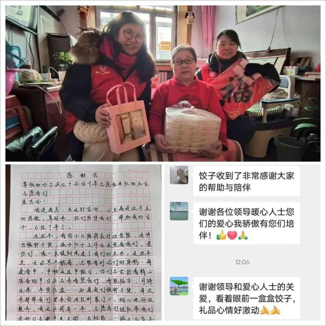 市红十字四叶草志愿服务队延续十年传统,开展系列暖心活动。农历腊月初八,组织爱心司机、志愿者及小小志愿者代表,赴平房区各角落为在岗环卫工人送上温热的腊八粥与新春祝福,十年坚守化作彼此间的默契与温情。同时,志愿者联合巾帼爱心车队,兵分两路走访14户特殊家庭,送去腊八粥、防臭袜、毛巾、春联及纯手工爱心饺子。其中,与潘彦家庭两位老人的十年志愿情尤为动人,志愿者不仅常年送去生活物资,更陪伴行动不便的潘阿姨走出家门赏景购物,见证她从内向到开朗的转变,潘阿姨特意委托外孙女写下感谢信,字里行间满是感恩,双方相拥而泣的场景令人动容。