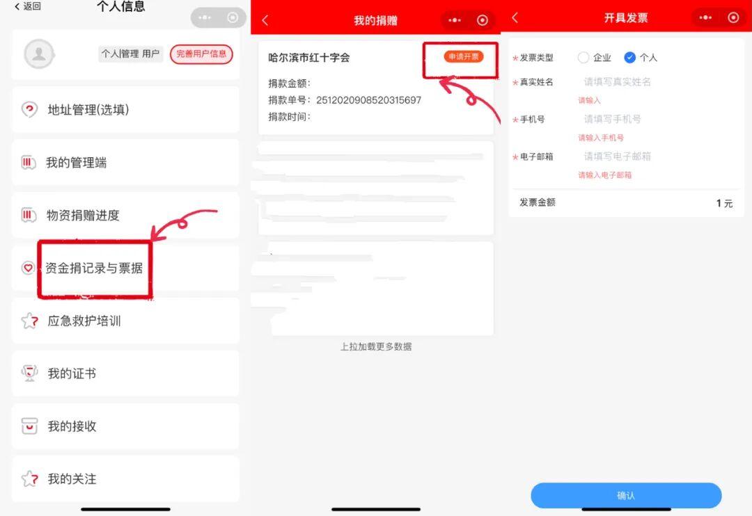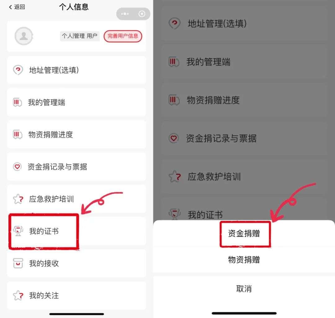 第四步:捐赠结束后,可返回个人信息界面,点击“我的证书”→“资金捐赠”查看捐赠证书。捐赠人若有开具电子发票需求,可在个人信息界面点击“资金捐记录与票据”→“申请开票”。