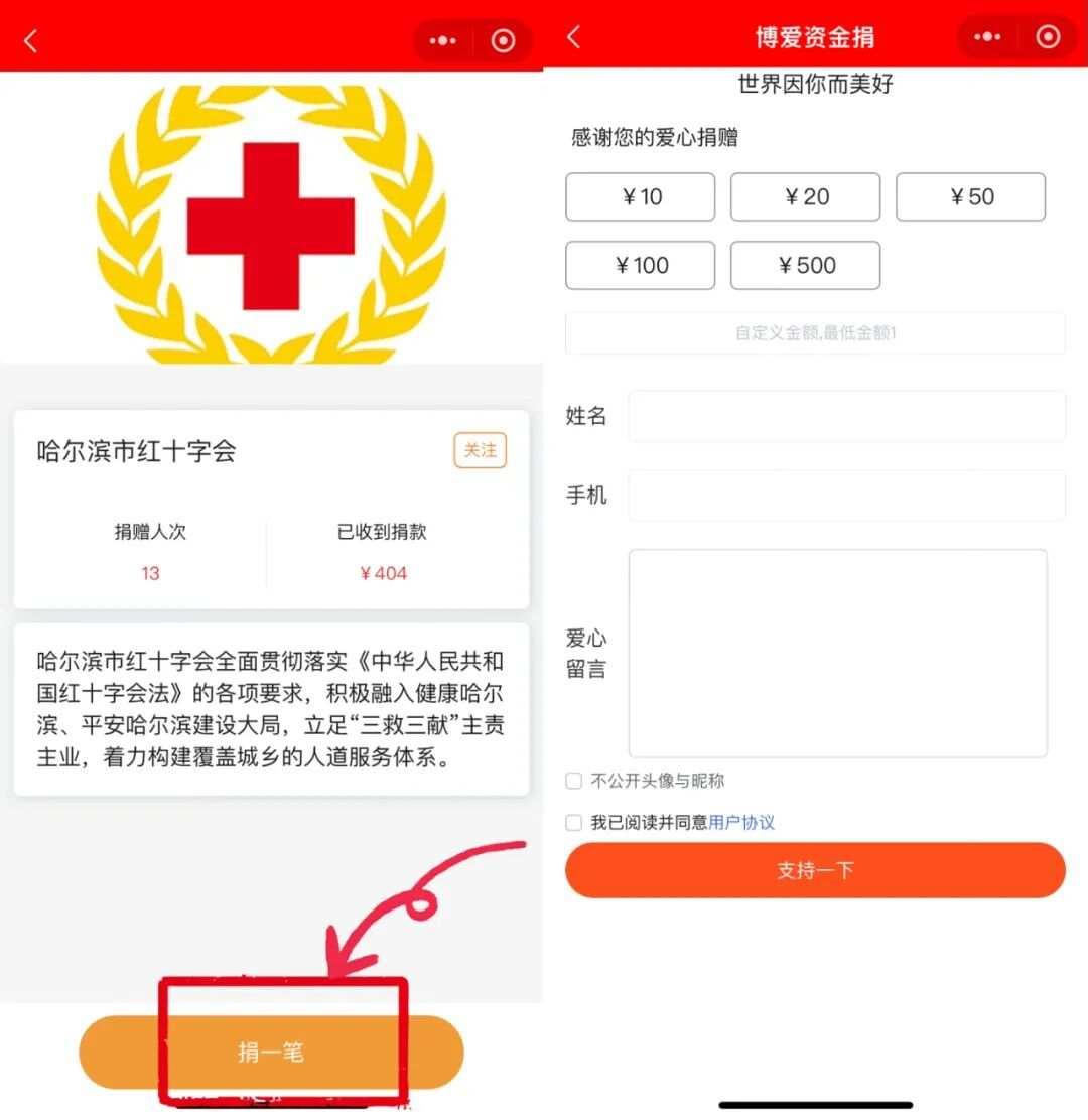 第三步:保存个人信息后,返回“博爱通”小程序主页,点击“博爱通资金捐”→“博爱单次捐”→选择“黑龙江省哈尔滨市红十字会”→点击“捐一笔”,进行捐款。姓名、联系方式、爱心留言均为选填。