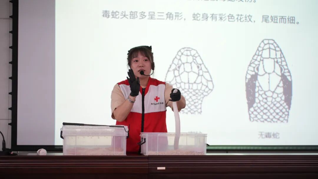 在心肺复苏及AED使用授课中,市红十字救护师资细致拆解动作,从细节着手,规范化讲解胸外按压的标准姿势及AED使用技巧。针对地质工作中常见的外伤风险,培训还从大腿及小腿骨折固定、脚腕挫伤及意外出血等常见野外受伤情形出发讲解创伤救护技能。师资团队结合我省常见的毒蛇种类,现场使用宠物蛇让学员了解毒蛇与非毒蛇的区别,细致讲解被蛇咬伤的处理步骤:“被咬伤后不要用嘴吸、不要切开伤口,先远离受伤地点,用绷带在伤口近心端包扎,尽快联系当地林业医院,同时记录咬伤时间和蛇的特征……” 这些实用知识,让现场和屏幕前的学员们直呼 “及时雨”:“每年夏天出队都怕遇到蛇,现在知道该怎么应对了,心里踏实多了!”